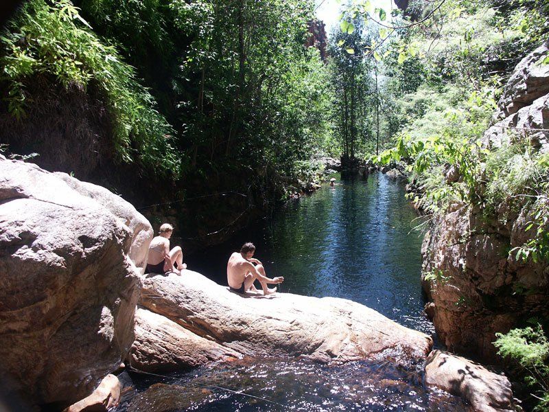 The first part is especially slow and easy as we stop and explore some of the small southern gorges along the way. Eventually we reach a base camp about 12–13 kilometres up Piccaninny Gorge, where sheer red cliffs are silhouetted against the clear blue skies of the dry season.