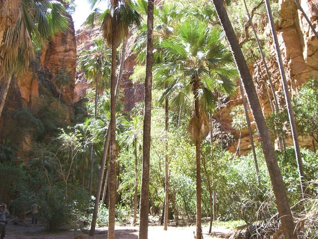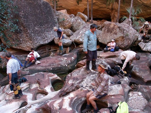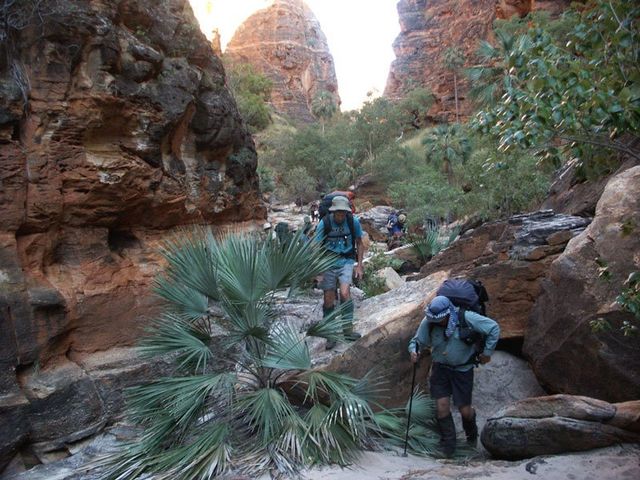 We hike up Piccaninny Creek and spend nine days exploring the many side gorges, mostly without full packs. These gorges offer a variety of delights — some are palm filled, some are very narrow and require swimming, some have caves which require the use of a torch. There is at least one gorge that allows us to reach a high point. No words can do justice to the beauty of the area. The only way to appreciate it is to come and see it for yourself.