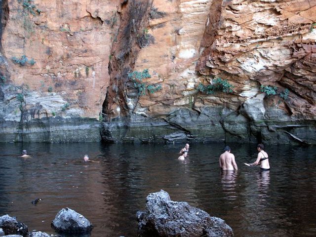 Eventually we reach a base camp about 12–13 kilometres up Piccaninny Gorge, where sheer red cliffs are silhouetted against the clear blue skies of the dry season.