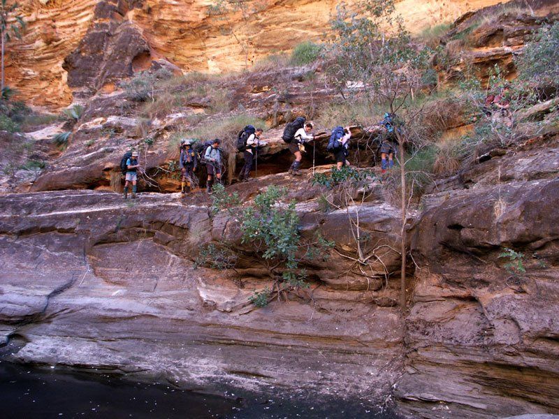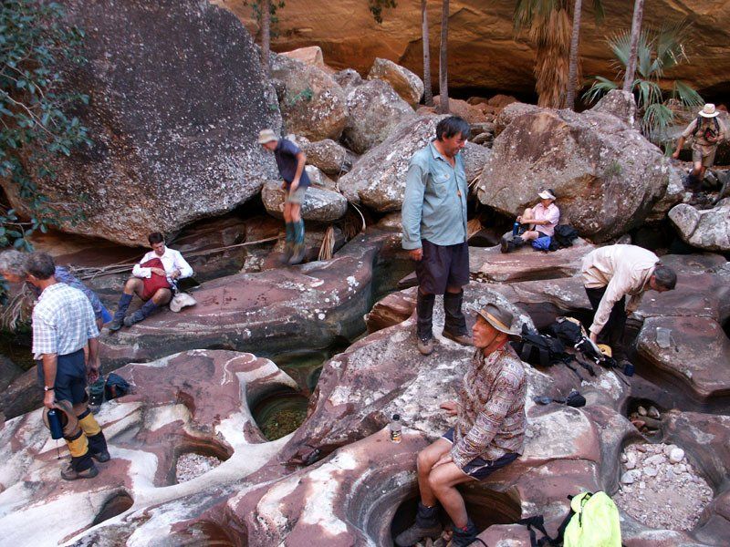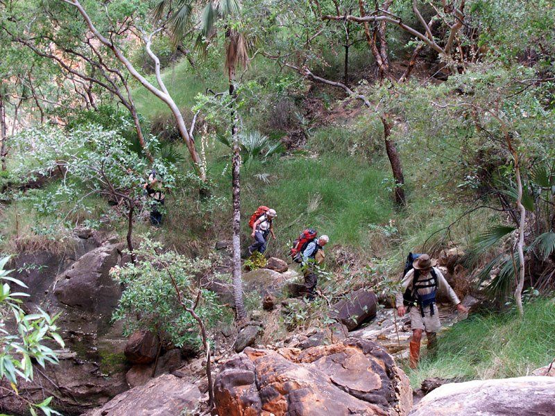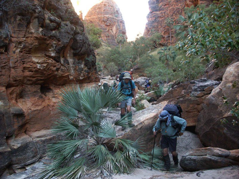 We hike up Piccaninny Creek and spend nine days exploring the many side gorges, mostly without full packs. These gorges offer a variety of delights — some are palm filled, some are very narrow and require swimming, some have caves which require the use of a torch. There is at least one gorge that allows us to reach a high point. No words can do justice to the beauty of the area. The only way to appreciate it is to come and see it for yourself.
