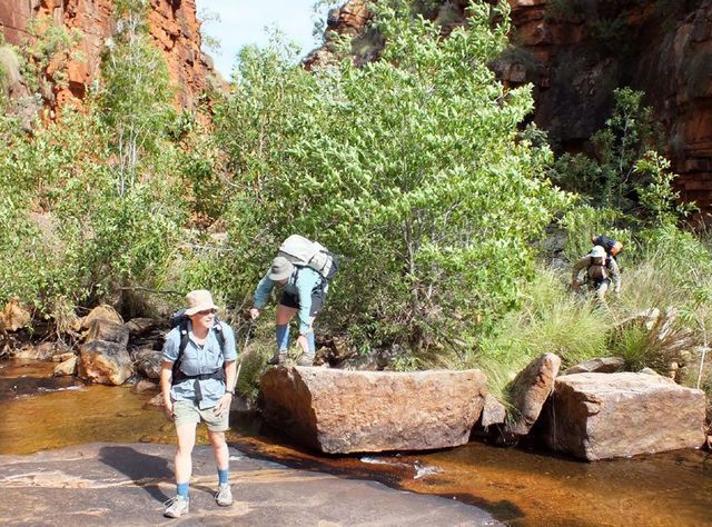 From the drop off, we work into our way into a gorge then up onto the plateau. The climb is fairly steep. Parts are as difficult as anything we encounter on the rest of the trip. Once on top, the walking becomes easier and we should be able to get to a pool in time for lunch and a swim.