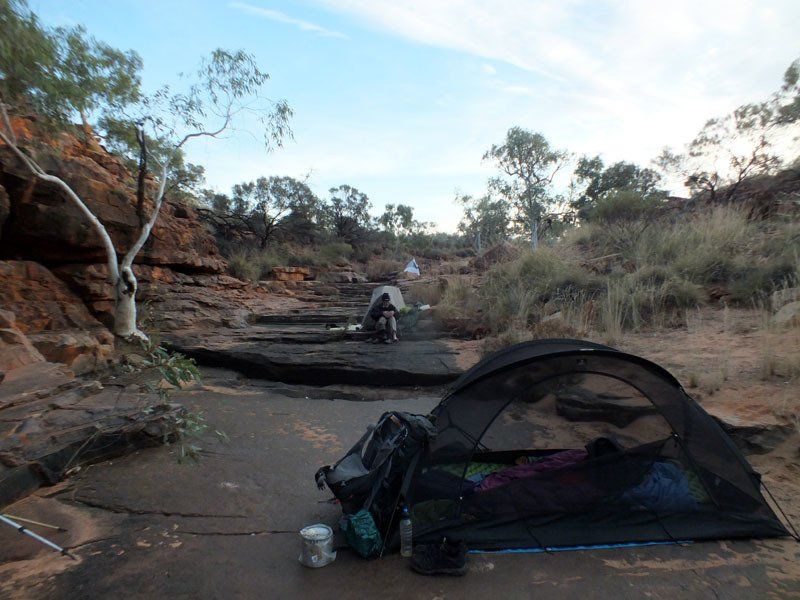 We follow a marked track into Ormiston Pound and set up camp near a waterhole.