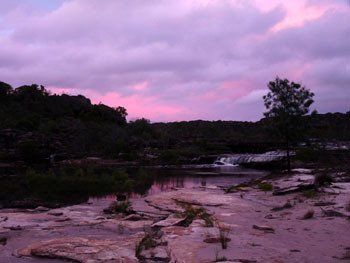 Althought Gubara Springs flows all year, the upper reaches of Baroalba Creek stop flowiing fairly early in the dry season. This is why we only visit the area in the wet and early dry seasons the two photos here show one of our wet season campsites and a sunset we saw while we were there.