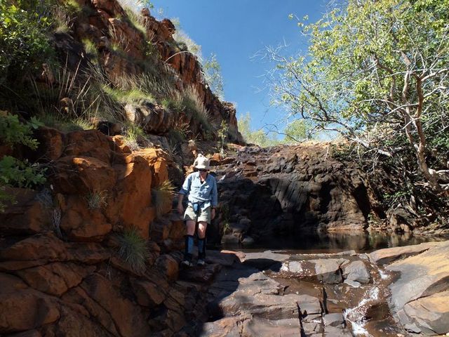 Varies dramatically from year to year depending on when last burnt. If recently burnt, it’s easier than the description here. Some of the walking will be fairly open and some will be through thick grasses including spinifex, gaiters essential, long trousers recommended.