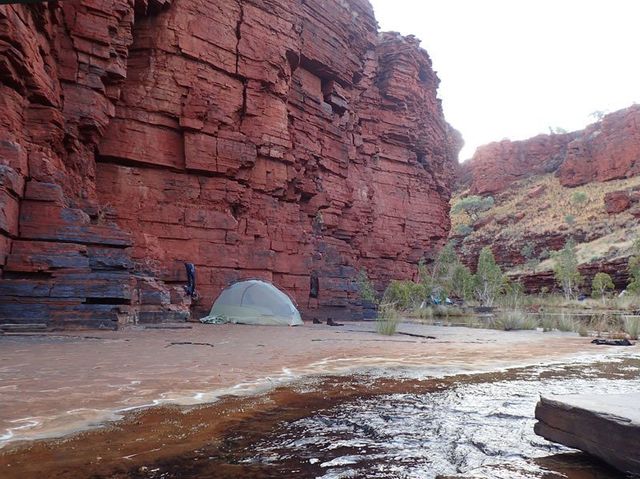 The terrain is a mix of open woodland, rocky and swampy watercourses and spinifex scrub. There will be a number of short but steep climbs and one long, steep climb down into Wittenoom gorge. Some of the optional day walks will include sections where you need to go along narrow ledges. Some sections go through thick grass that hides rocks so you need to watch every step. If it weren’t for the fact that we often do day walks from base camps, this trip would rate as HARD/level 4 rather than MODERATE/level three.