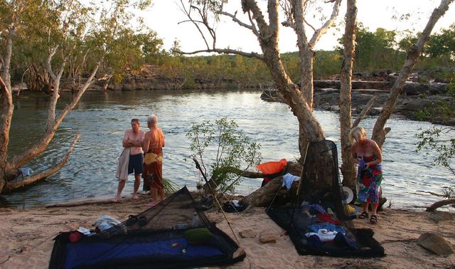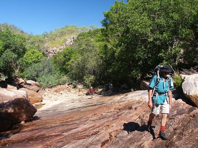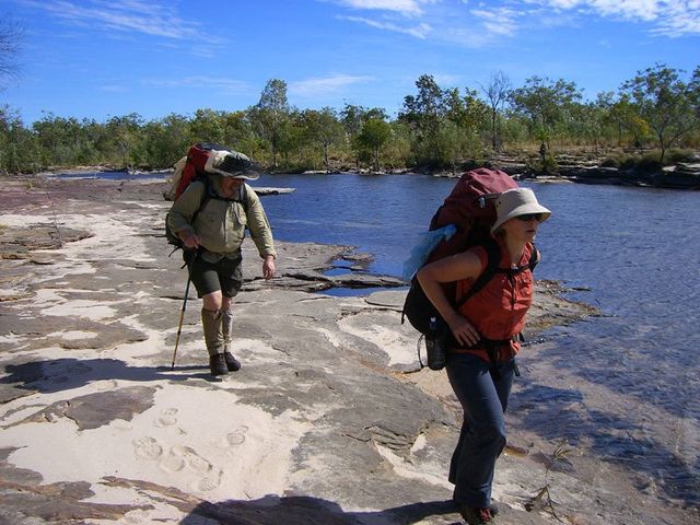 The walk down Freezing Creek below the gorge involves climbing over and scrambling around large boulders. We camp near the bottom. Next day, we return to the cars and drive to Cooinda for a relaxing night in the campground, a pub meal and a Yellow Waters cruise. If available, we will do the Animal Tracks tour as well.