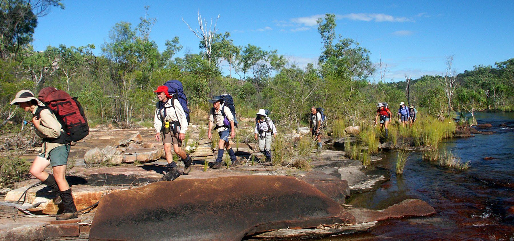 Much of the walking is through relatively flat, open woodland with a grassy understorey. Some short sections of grass may hide a broken rocky surface where you will have to be particularly careful. There may be some slow sections where you will have to pass though thick scrub. The vegetation can vary from year to year depending on when last burnt. At this time of year, the spear grass has finished seeding and dried out.