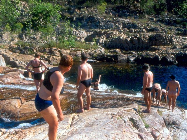 The pools and art sites are too nice to pass by, so stops are frequent as we make our way down to the cascades for which the creek is named. The last 500 metres often takes two hours or more as the deep pools and a natural water slide are much too inviting to rush past.