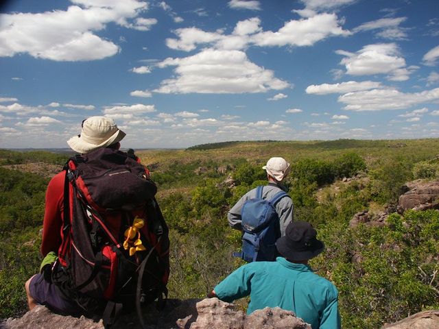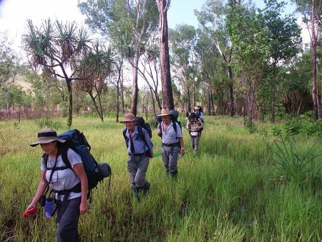 Much of the walking is through relatively flat, open woodland with a grassy understorey. Some short sections of grass may hide a broken rocky surface where you will have to be particularly careful. There may be some slow sections where you will have to pass though thick scrub. The vegetation can vary from year to year depending on when last burnt. At this time of year, the spear grass has finished seeding and dried out.